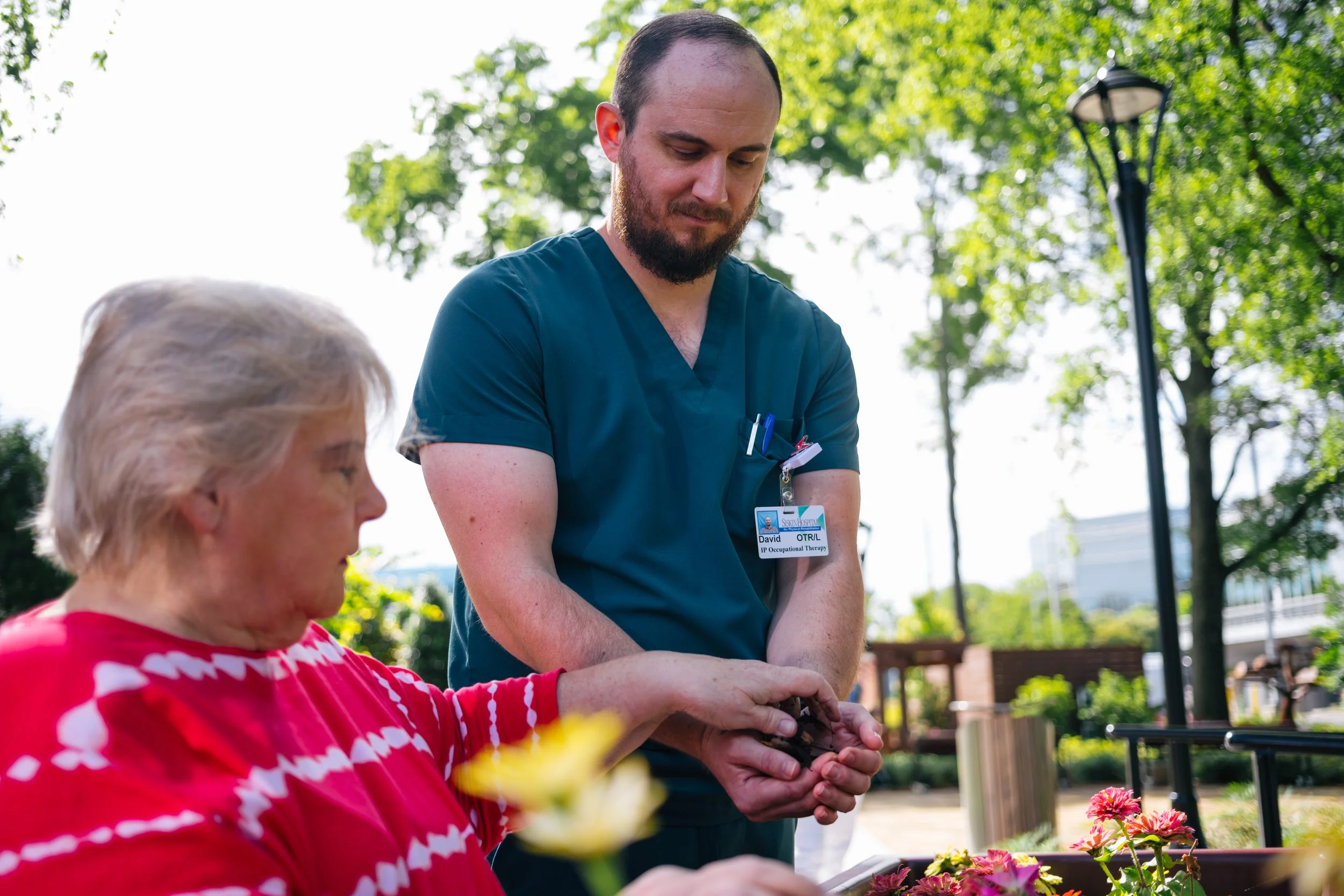 Patient receiving occupational therapy in Grady’s Garden through raised planters