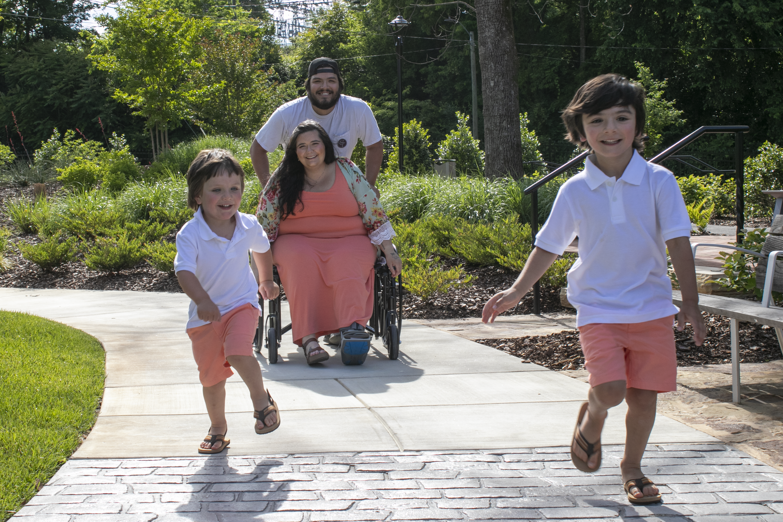 Patient and her family enjoying time together outside in the Healing Garden